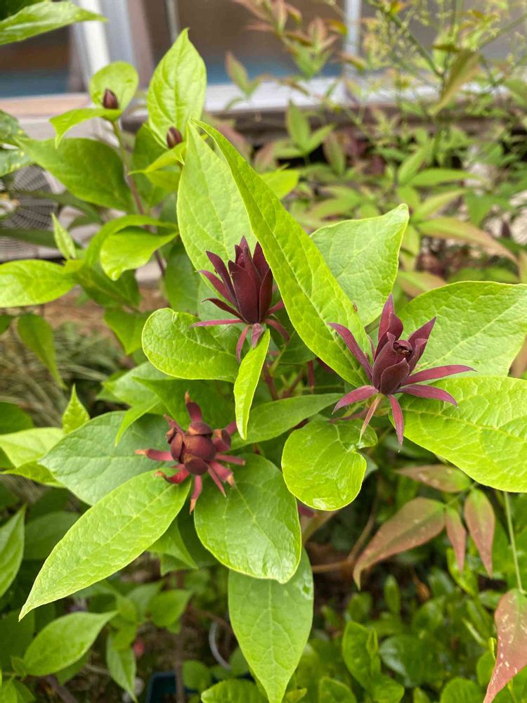黄緑色の葉っぱに紫色の蕾が付いています。