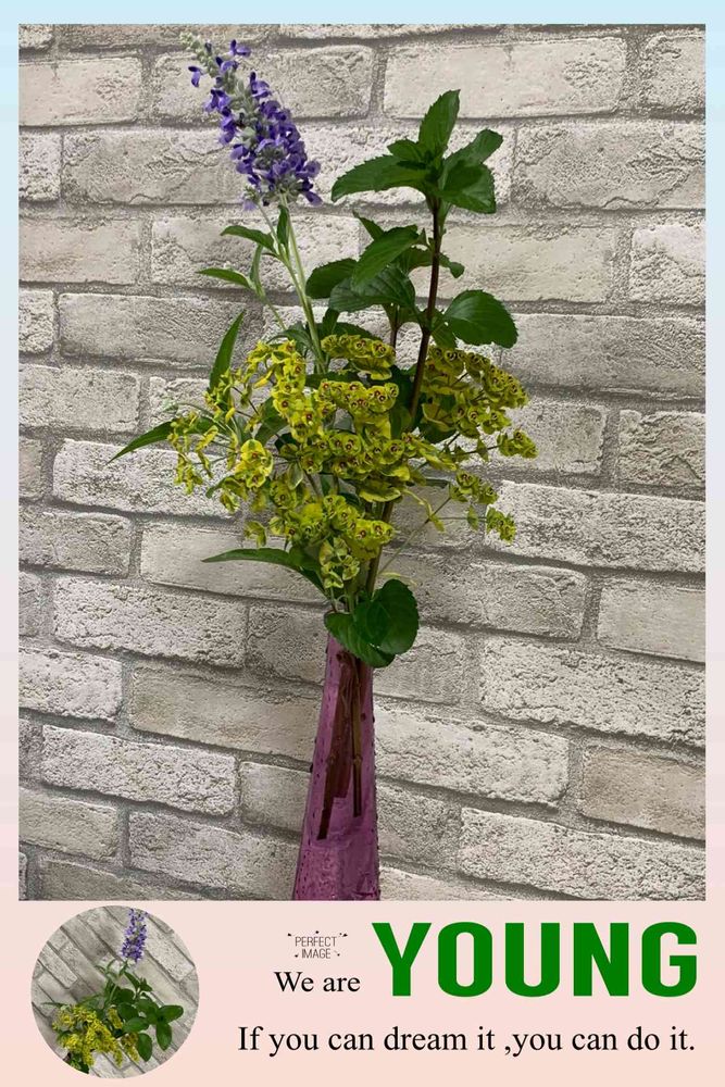 ブルーサルビアとスペアミントとユーフォルビアゴールデンレインボーを花瓶に挿しました