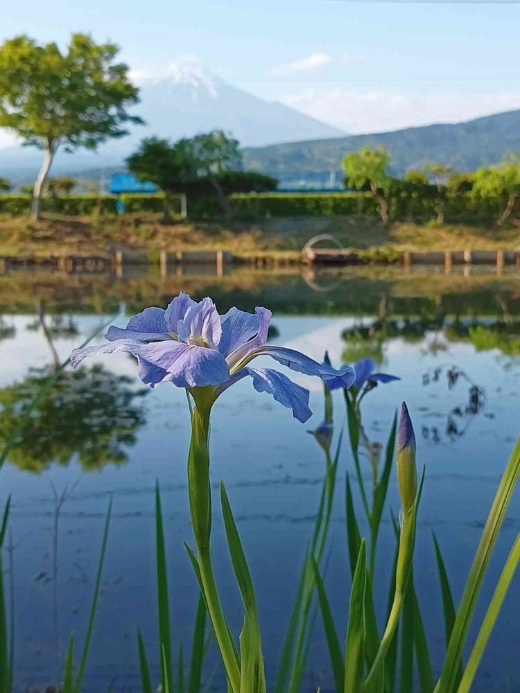 富士山🗻と池と菖蒲のコラボ、綺麗です。💜