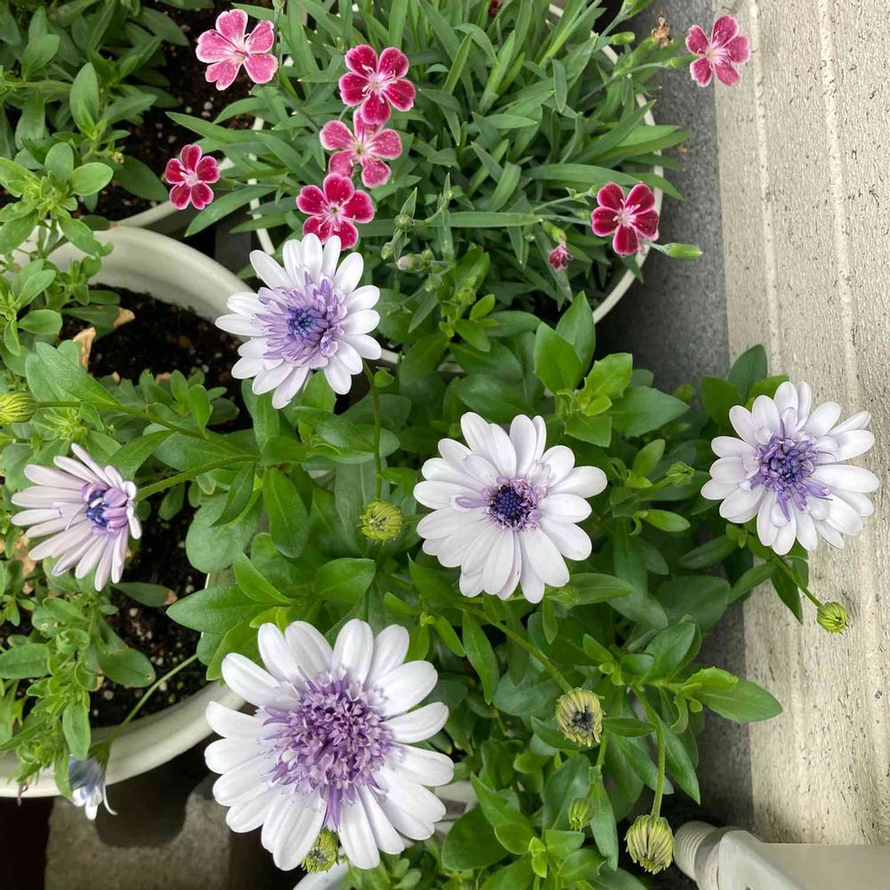 ビオラを全部駐車場に集めたとたん、目立つようになったダブルオステオスペルマム🤍💜🤍