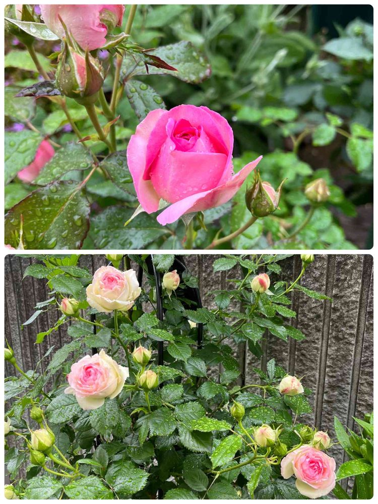 ルポールロマンティークも咲いてます。ピエールドゥロンサールも昨日より開いてます。今日も朝から小雨🌂庭パトしながらの撮影📸来年は性質は同じ枝変わりのこの子たちをコラボしたいです。この狭い庭のどこへ誘引するかが難題です。😮💨😮💨