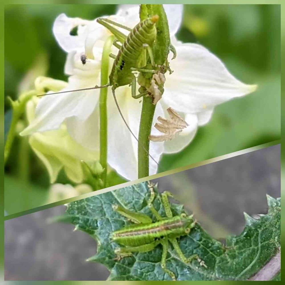 今朝ここにもここにもキリギリスの赤ちゃん… 昨日もハルジオンのお花の上にいましたが もしかしてキリギリスではなくヤブキリの赤ちゃんかもしれません 背中の線が見分けるポイントらしいのですが 私には見ても未だよく分かりません…