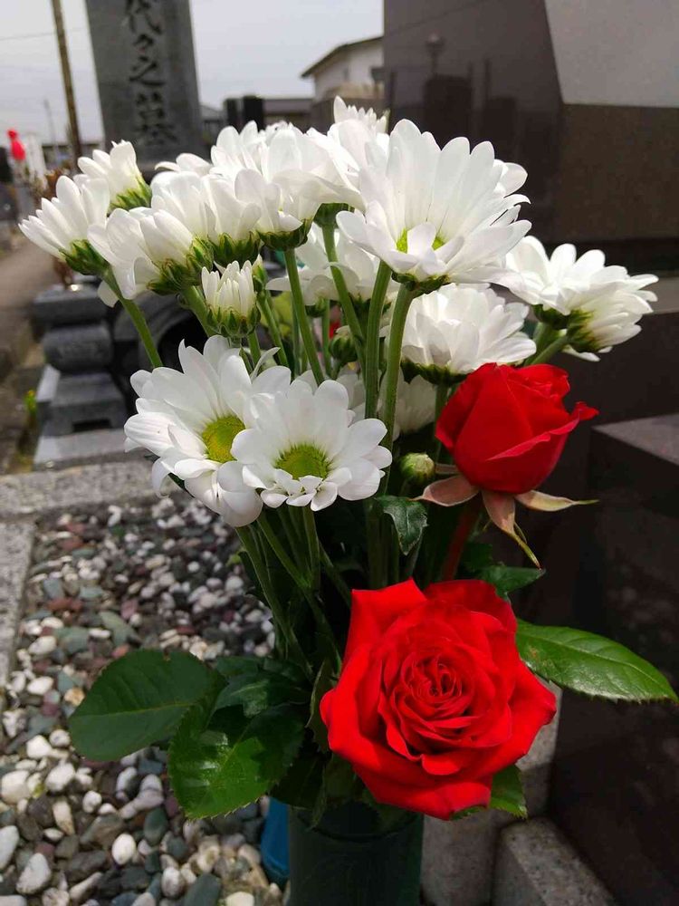 わが家の赤いミニバラをお供えしてきました🌼🌹