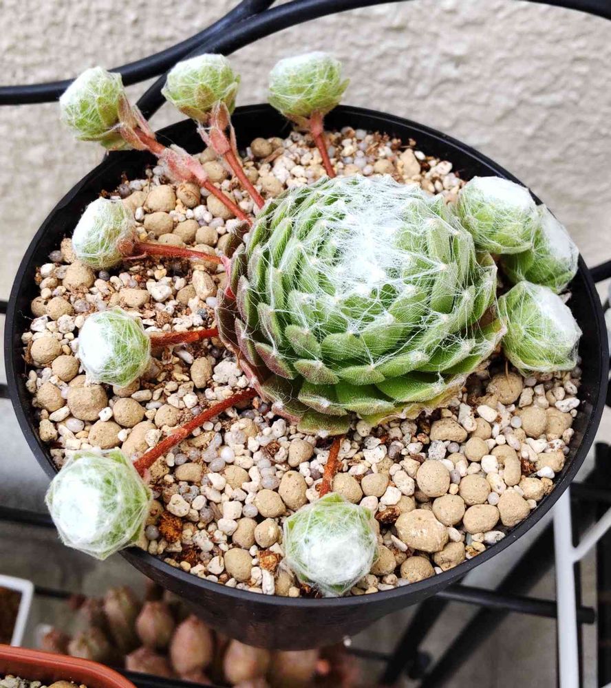 葉先を繋ぐように広がる白い糸がまるでクモの巣のように見えることから、センペルビウム属の糸をまとった品種には"蜘蛛の巣万代草"という呼び名もついているのだとか🕸️🕷️