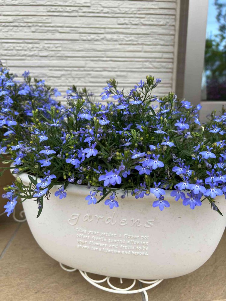 サントリーのアズーロコンパクトです。植え付けてから一か月過ぎたところです。プランター二つに植えて今が満開といった所でしょうか。切り戻す前に一枚撮りました。