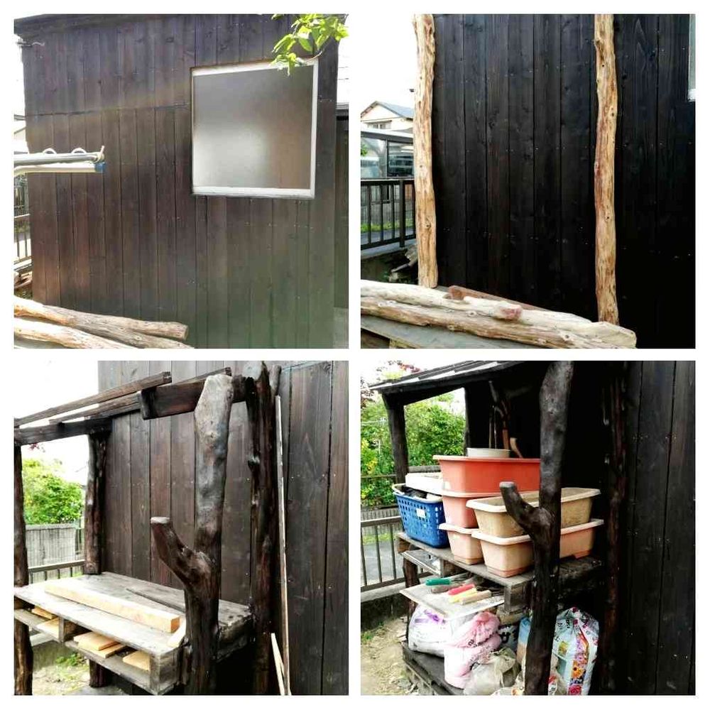 柱は、生け垣のカイヅカイブキを伐採した時の木を磨き、その他は小屋の廃材を利用しました。