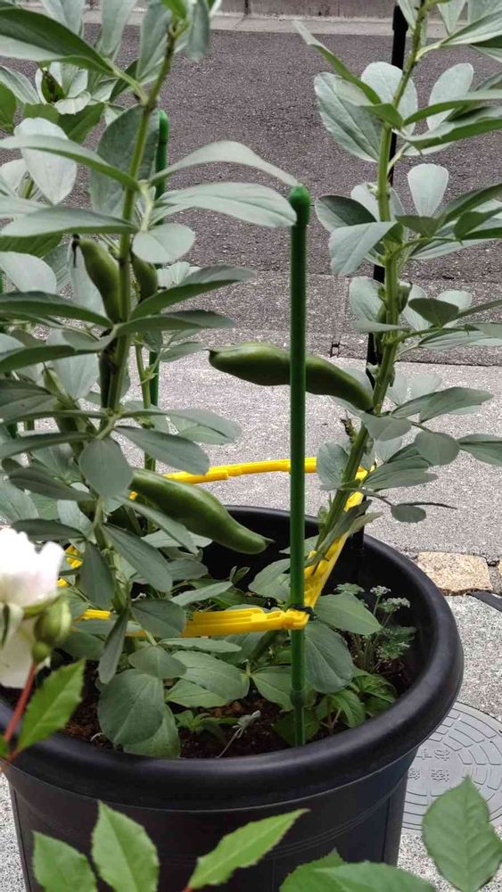 種から育てたそら豆。ミニトマトよりずっと簡単で甘くて美味しい!バラを植える予定だった鉢はずっと野菜に占領されている。