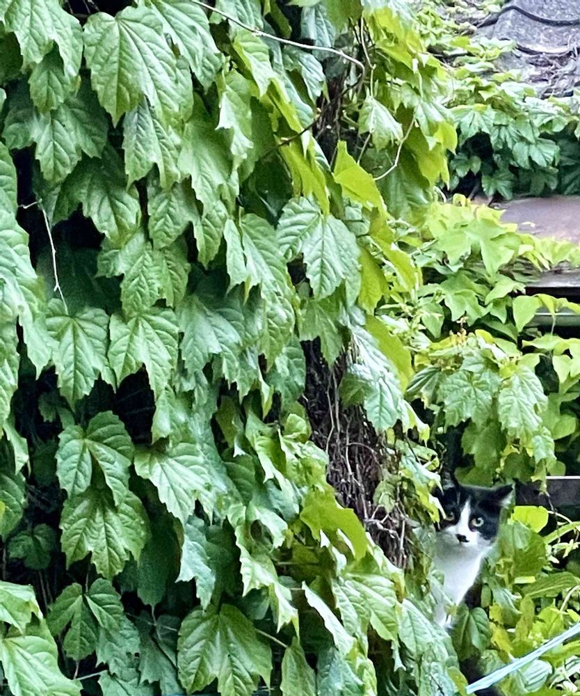 緑の葉に覆われた壁の向こうに潜む猫🐈⬛
