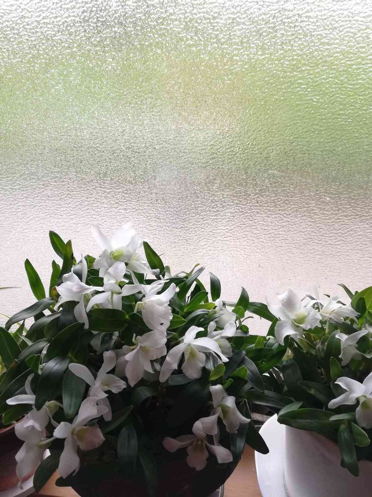 キッチンの窓辺に置いています。2鉢共、挿し芽の年から咲いてくれて小ぶりの白い花を長く楽しめます♫