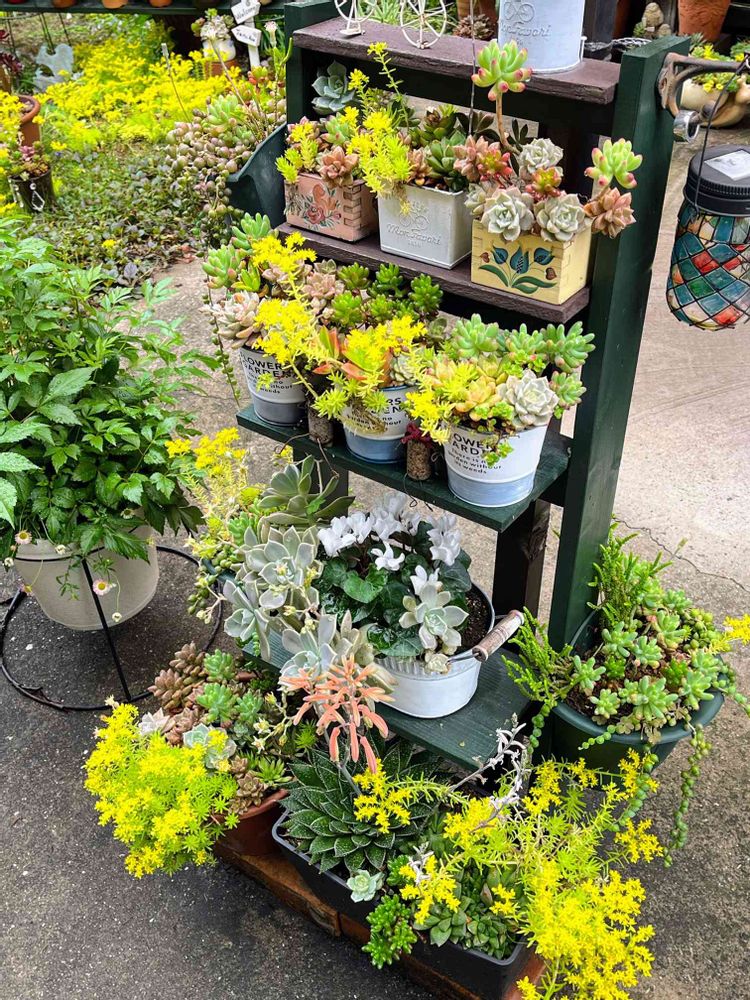 多肉の寄せ植えにちょこっと植えたセダムが花を咲かせ多肉棚を黄色く染めています💛