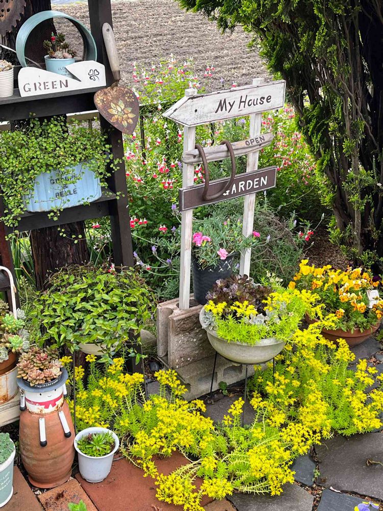 地面に敷いた石の隙間に植えたセダムも花を咲かせ地味な地面が華やかになりました💛😊