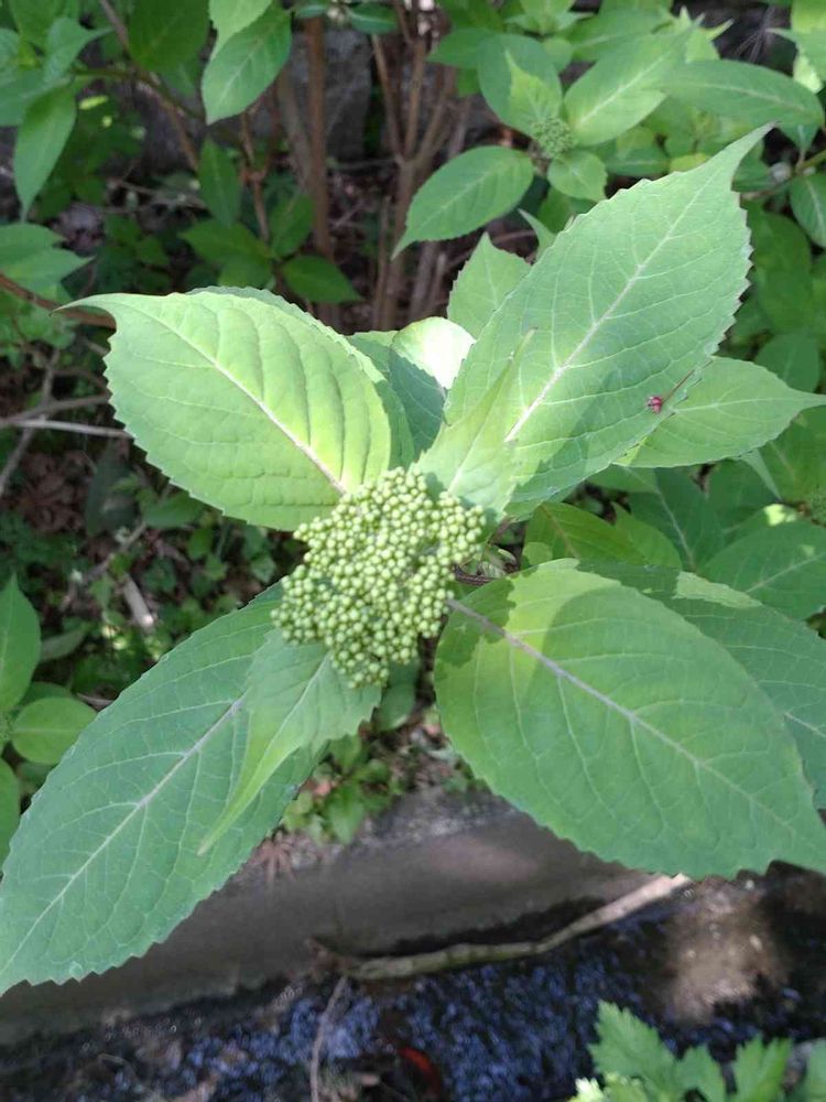 新緑が萌えるなか、山紫陽花が蕾をつけています。
