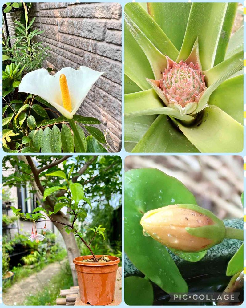 カラーが咲き、ピンクのエゴノキの挿し木苗が咲き、パイナップルとアサザが蕾を付けました。