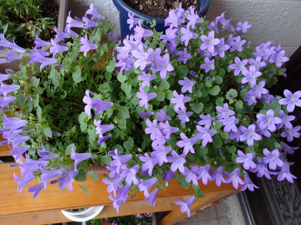 今日は雨なので、玄関のオトメギキョウです。こんもり咲いてくれました。