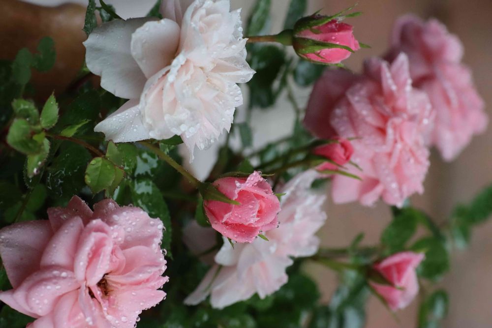 雨で玄関先に避難した鉢植えのミニバラ ピーチ姫。残念ながら雨を避けきれず濡れています。