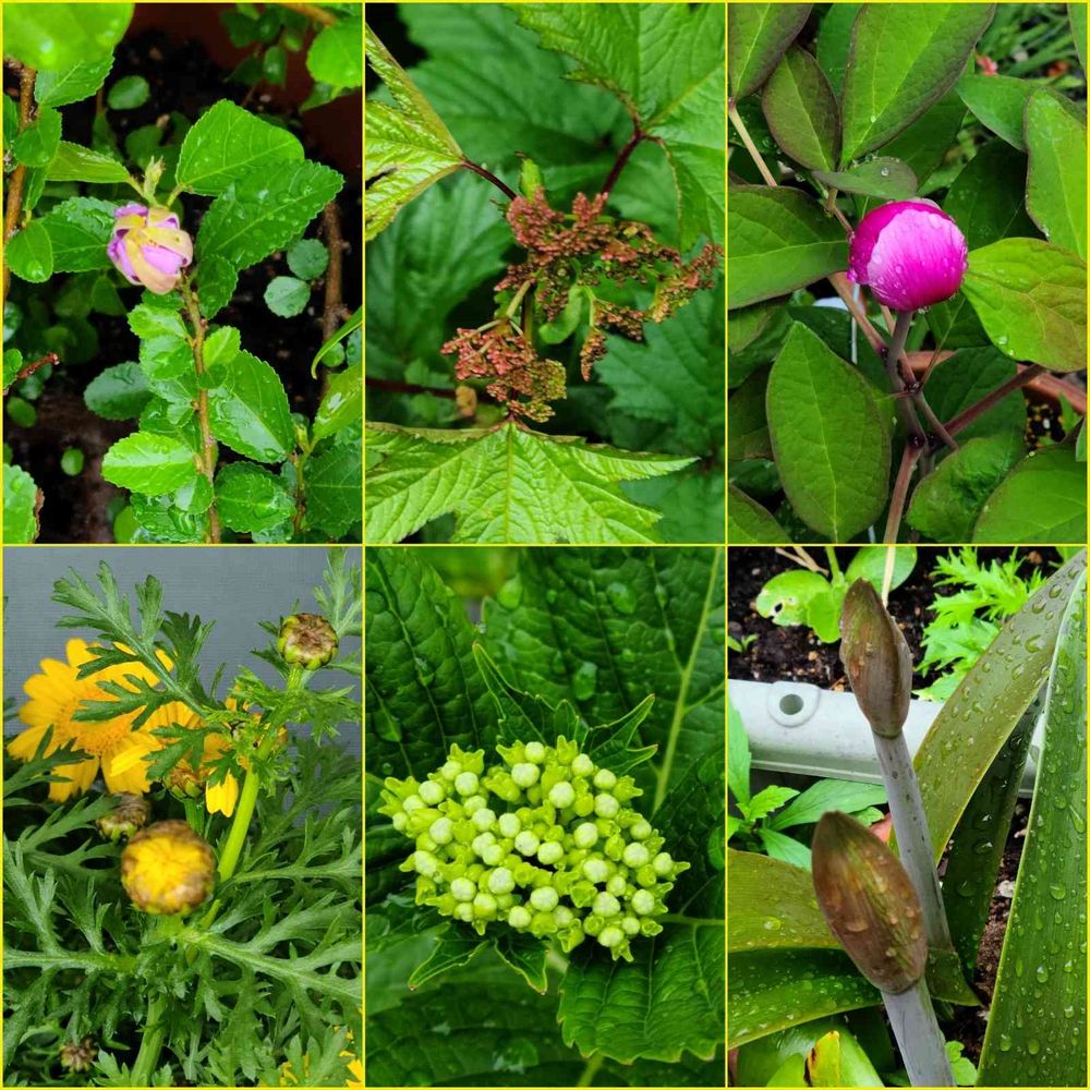 左上からスイレンボク、キョウカノコ、ヤマシャクヤク(アカ)アマリリス、アジサイ、シュンギク