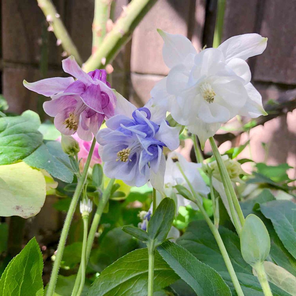いつも行くお花屋さんでこの三色が売ってたの。淡い色のダブルのオダマキは初めて見たから、全色買っちゃった。150円だったし❣️