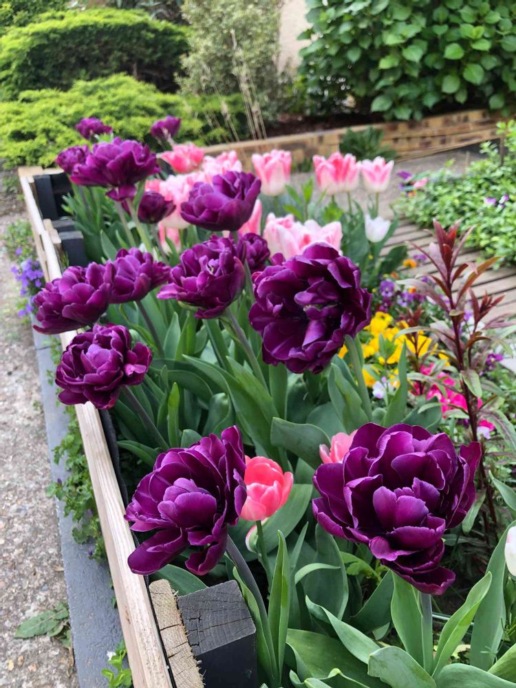 花壇のチューリップ、最後は紫の八重が咲きました🌷