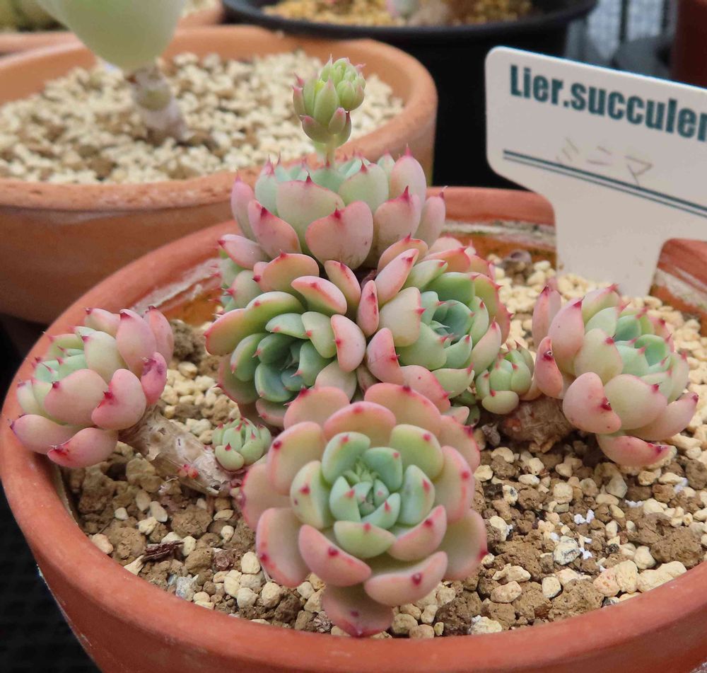 紅葉のピンクから緑に戻る途中の柔らかい色合いのミニマ。群生の天辺で一つだけ花芽が伸びてきた。ネットで見ると他のエケベリア代わり映えしない花で面白みはないけど,一つは咲かせてみようかと思う。
