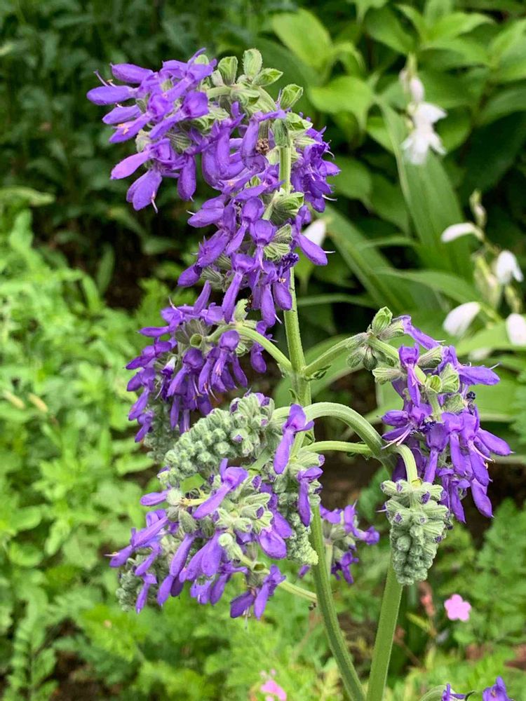 『ヌタンスは東ヨーロッパ原産の原種系サルビアで、濃いブルーの花を下垂させて咲かせるユニークな品種です。ブッシュ状の株姿となり、花茎を1mほどの高さに伸ばして、初夏から夏にかけてブルーの花をたくさん咲かせます。花壇の後方におすすめです。サルビアの中では寒さに強く、冬は地上部が枯れますが、翌春にはまた芽が出てきて年々大株に育ちます。』