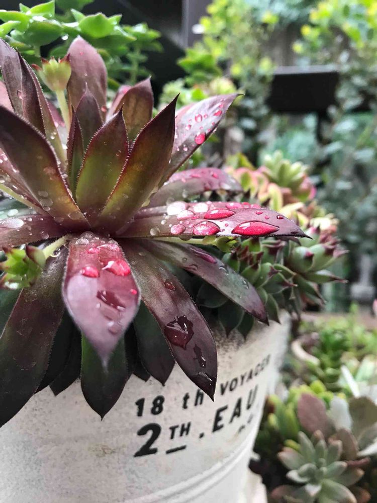 多肉ちゃんのしずくが 赤く見えます。
