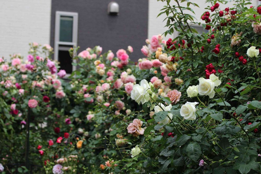 あはは、広そうに見えるかもですが、車2台分のスペースの庭なんです。フェンスに目一杯つるバラ誘引して、足の踏み場ないくらい鉢バラおいてしまってます😊。