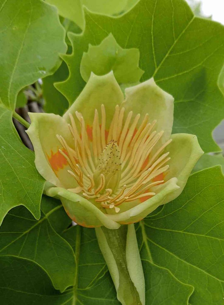 モクレン科ユリノキ属の落葉高木。北アメリカ原産。明治時代初期に日本に入り、1875年(明治8年)、新宿御苑に植樹されたのが日本初という。高さ30mにもなる木で、成長がよく公園樹や街路樹として広く植えられる。幅広の葉は滑らかで薄くて硬く、掌状に浅く4または6裂し、長さ3~6㎝の長い葉柄を持ち互生する。花期は5~6月。花はチューリップに似た鐘形花で直径5~6㎝。雄しべは線形で花床下部に、雌しべは花床に多数つく。花被片は9枚で、外側の緑白色の萼片3枚が反り返る。花弁のオレンジ色のラインから蜜が出る。秋には葉が濃い黄色に黄葉し鮮やかだが、すぐに褐色化しやすい。果実は細長い翼果が集まり松かさ状となった集合果で秋に熟す。上向きにつき、翼果はくるくる回転しながら落下する。種子は翼果の付け根のかぎ状部分にある。1~2個つくが秕(しいな)も多い。北アメリカでは蜜源植物として利用される。ネイティブ・アメリカンは本種の材でカヌーを作り、棺桶にも用いたという。