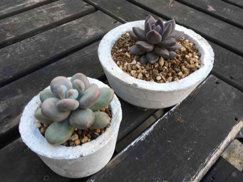 エケベリアの種類らしい多肉を植え替え。奥のはカップ麺の容器のセメント鉢。とりあえずゴツい。