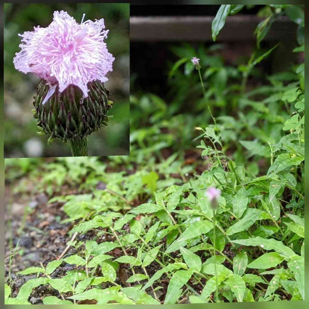 そのキツネアザミ…いつも観察しているデッキのステップ左側のお花は今日雨に濡れてふわふわは消えてとろけるようになっていましたがやはり素敵なピンク! しかも右側には小さな2株にピンクが見えて そこにいたのねと思わせてくれました