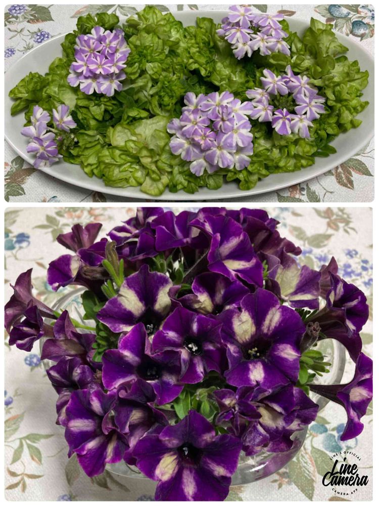 上は、花手水にしてみたいと思ったのですが、黄緑色の八重咲きのペチュニアは、もはやサラダにしか見えません😅