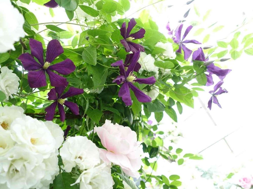 柔らかな白い薔薇に、赤紫のクレマチスを合わせて