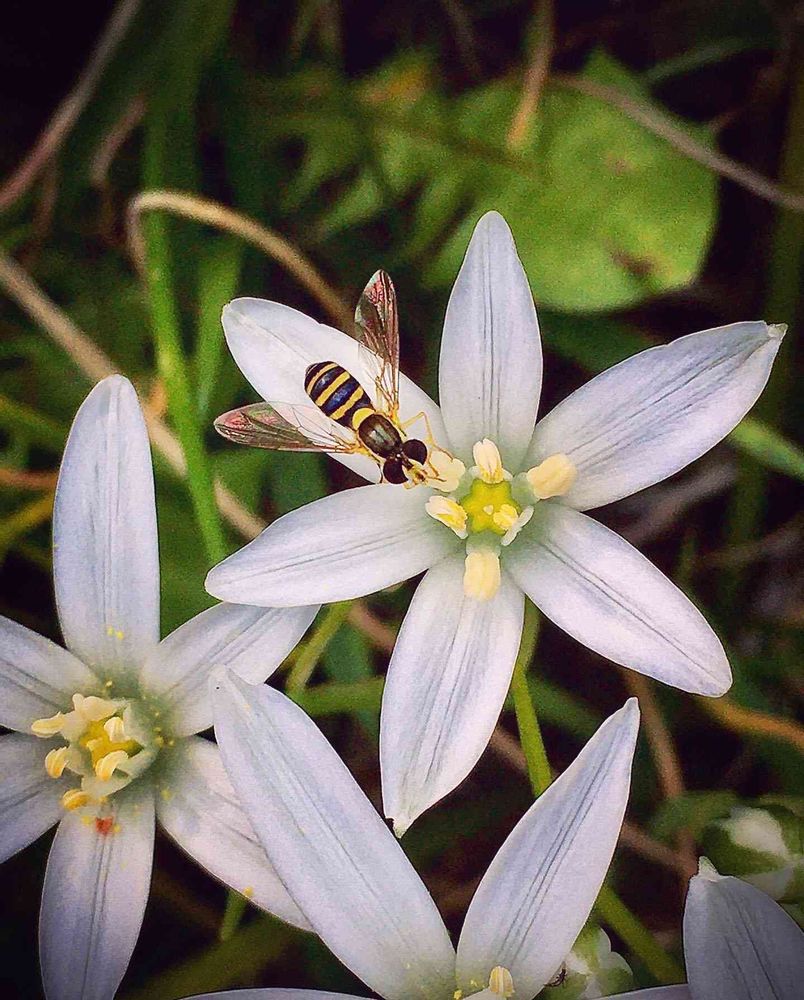 オオアマナの英名はStar of Bethlehem(ベツレヘムの星)…たしかに星っぽいですね😊 そこにハナアブが飛来して蜜を吸っています。前のpicの左上を拡大したようなものです😅