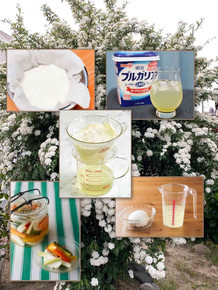 水切りヨーグルトとホエーはどのようにして作るのでしょうか? 「ざるにキッチンペーパーを敷き、市販のヨーグルトを入れて、数時間から一晩置きます。時間を短縮したいときには、ヨーグルトにキッチンペーバーでふたをして、その上に水を入れたビニール袋をのせて重しにします。こうすると水を切る時間は5~10分ぐらいに短縮できます。 そうして出た水分がホエーです。ヨーグルト450~500gが約半分になり、ホエーがコップ1杯程度とれるぐらいが、目安になります」(加藤さん)