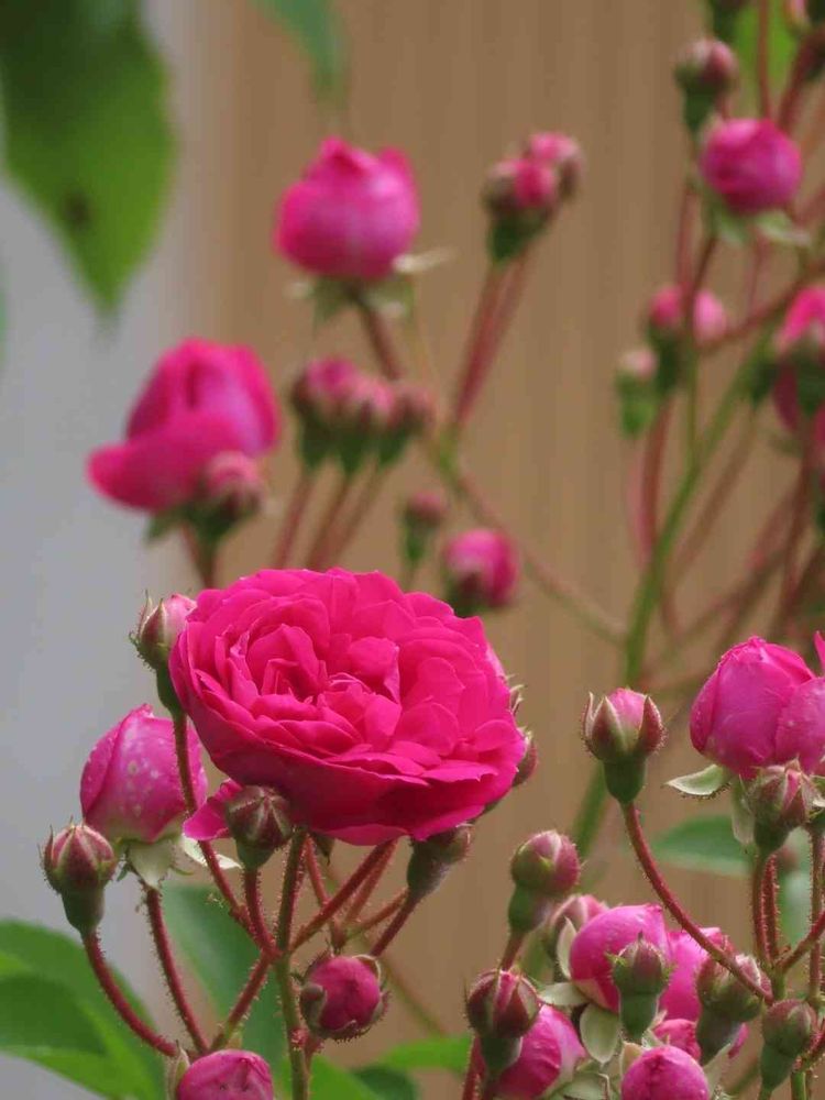 地植えのツルバラ、ダークピンクがようやく開花しました。