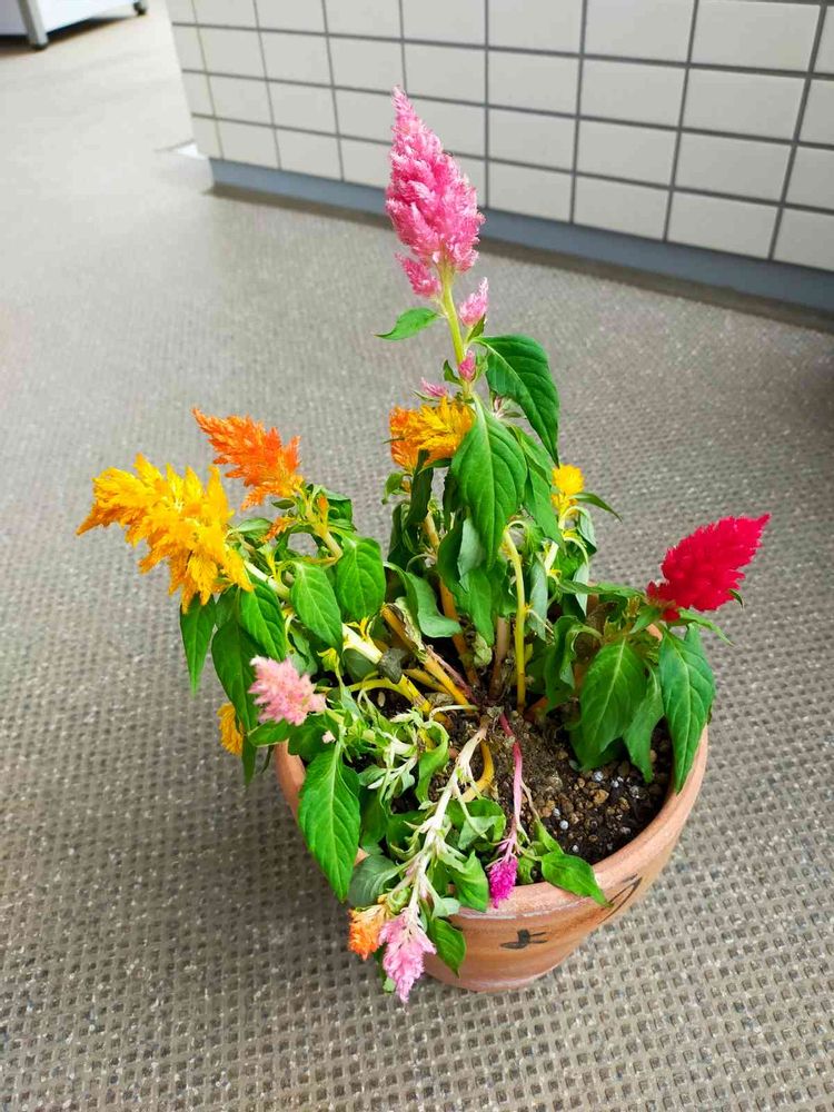 【教えてください】1週間位前に買ったケイトウも何だか萎れて来てしまいました。土は良いものを使っています。水のあげすぎでしょうか。ベランダの風が強すぎ?室内で育てた方が良いのでしょうか?
