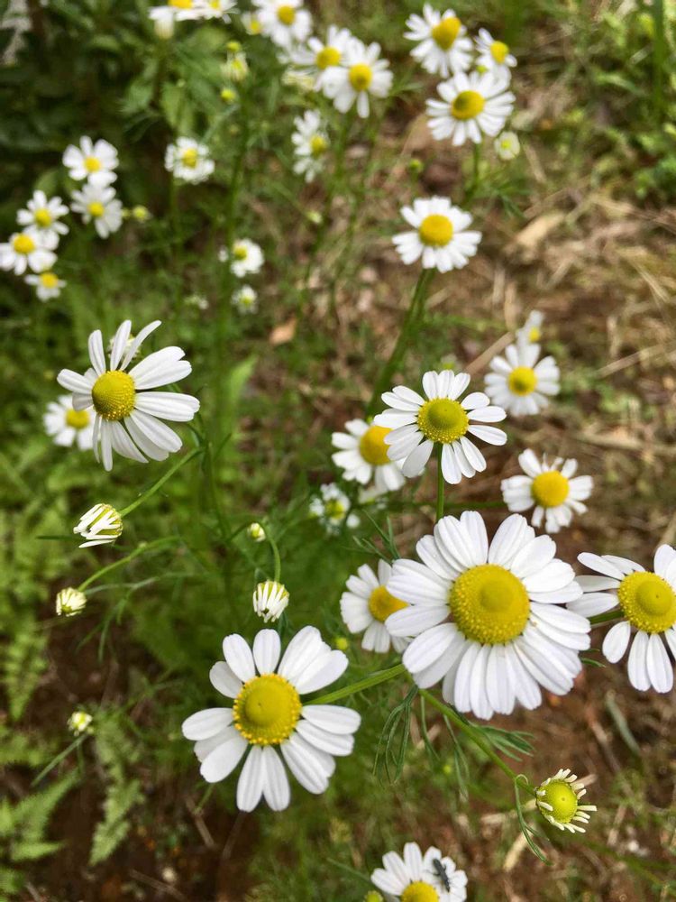 春の嵐も収まり、雨上がりの庭に出てみたら、カモミールがたくさん咲いてました🌼