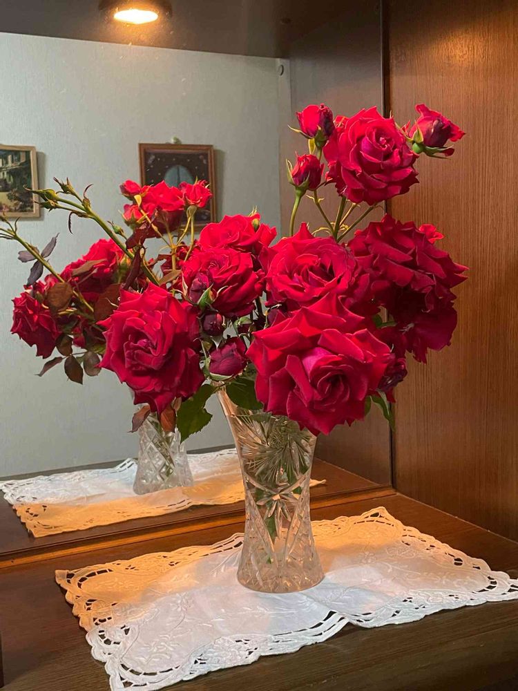 長いシュートの先に 咲くので 雨前に全部切って 玄関に飾りました🌹🌹🌹🌹