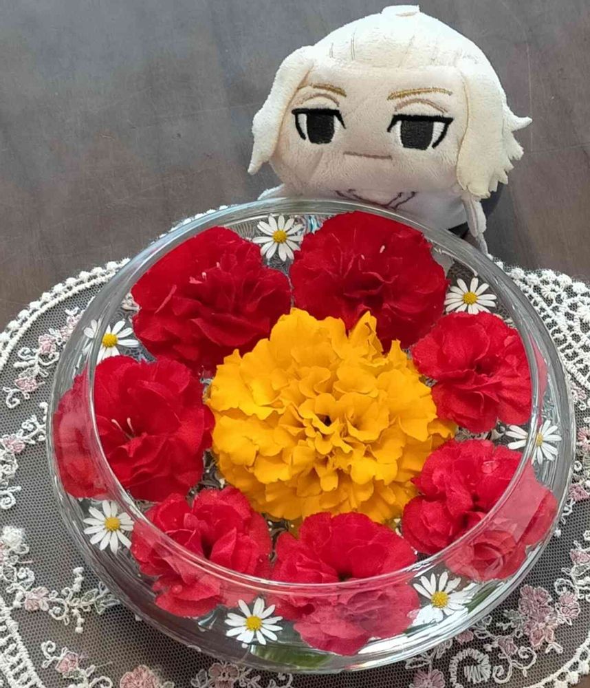 行きつけの花屋さんでかわいいカーネーションが売っていたので購入して早速浮かべてみました😉カーネーションの赤がマリーゴールドのオレンジと相性バッチリ👍