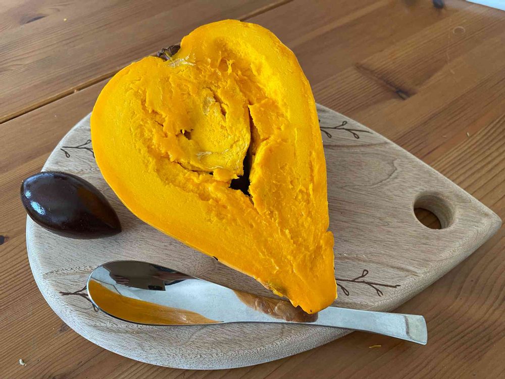 預かった時はカチコチに固いけど、二週間経つとポポーみたいに柔らかくなったので、娘の所に持って行きたいカニステル カット🎶