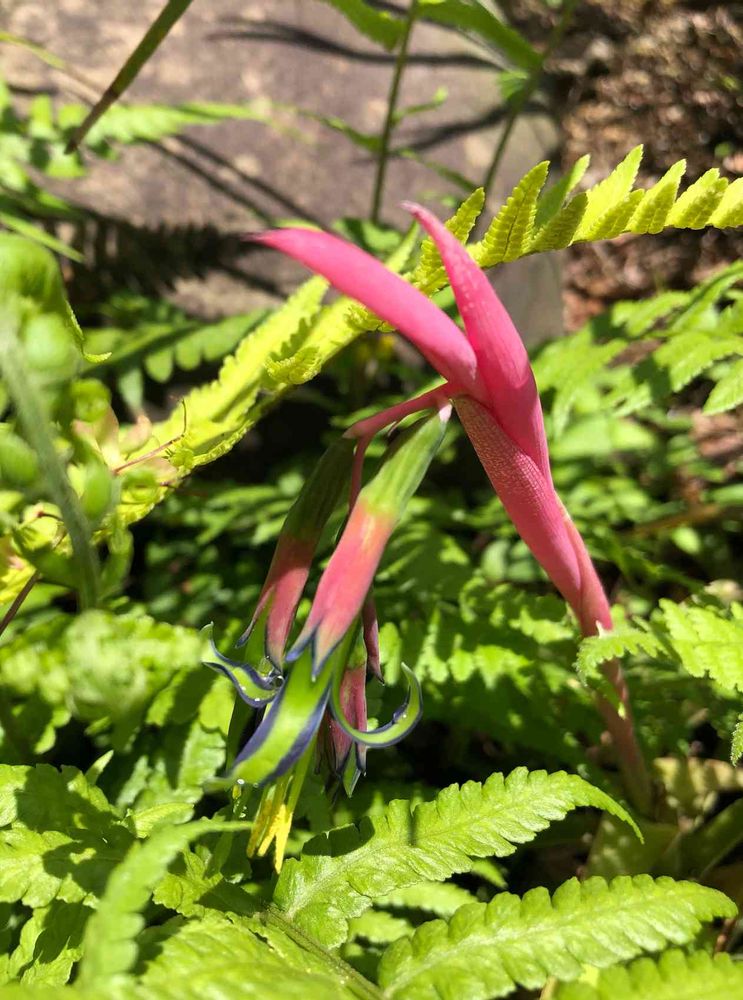昨年植えた、ヨウラクツツアナナス(女王の涙)の花が、シダの隙間からこっそり顔を出していました。