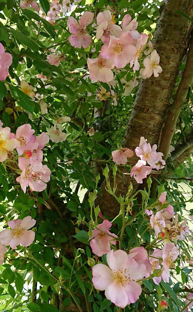 サクラの木に薔薇を接ぎ木したのでしょうか? それともサクラの木の側に薔薇が植えてあるのでは?と思いました😅