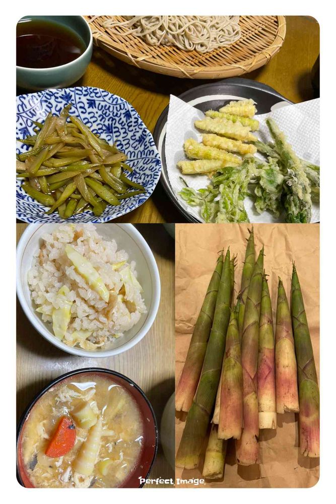 竹の子ごはん、汁、天ぷら、ウドのキンピラ、竹の子を皮付きでトースターで蒸し焼き😙💕