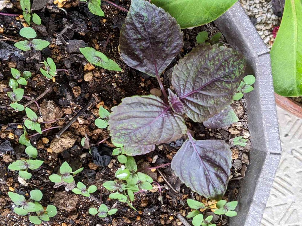 先日移植した薬味用の紫蘇、なぜか周囲から紫蘇の芽が吹き出してきました💦種が混じっていたのかな?移植の意味が薄れました、、間引かなくては😅