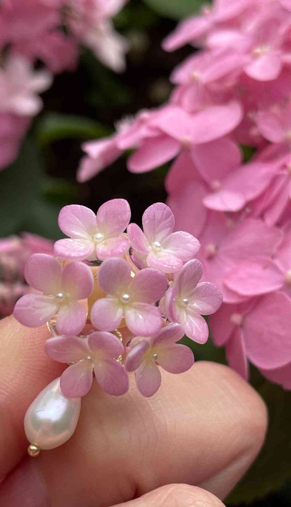 バースデー記念樹のピンクの紫陽花に合わせて樹脂粘土で出来た紫陽花のピアスをいただいたそうです♪
