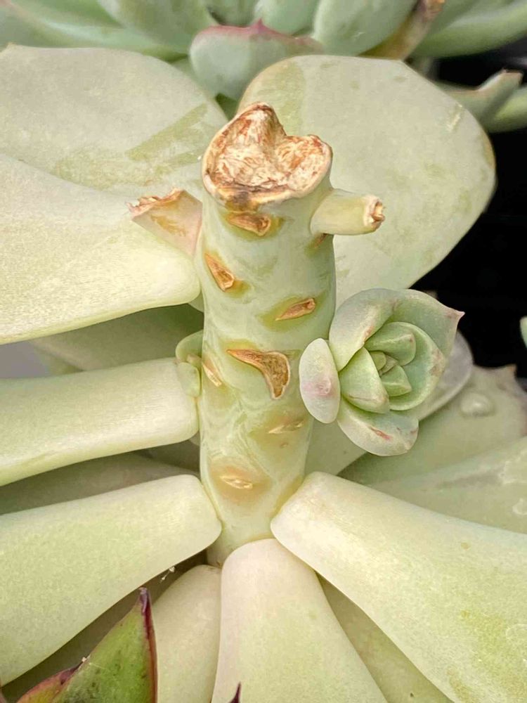 葉挿しもたくさんとるんですが、茎の方に成長点残ってしまうと、子株が茎につきます。