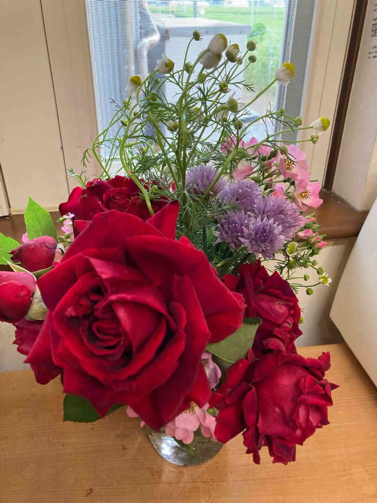 小雨です。バラが去年より少しさみしい感じ。花びらが傷んじゃってかわいそう😢このまま職場へ持っていきます。