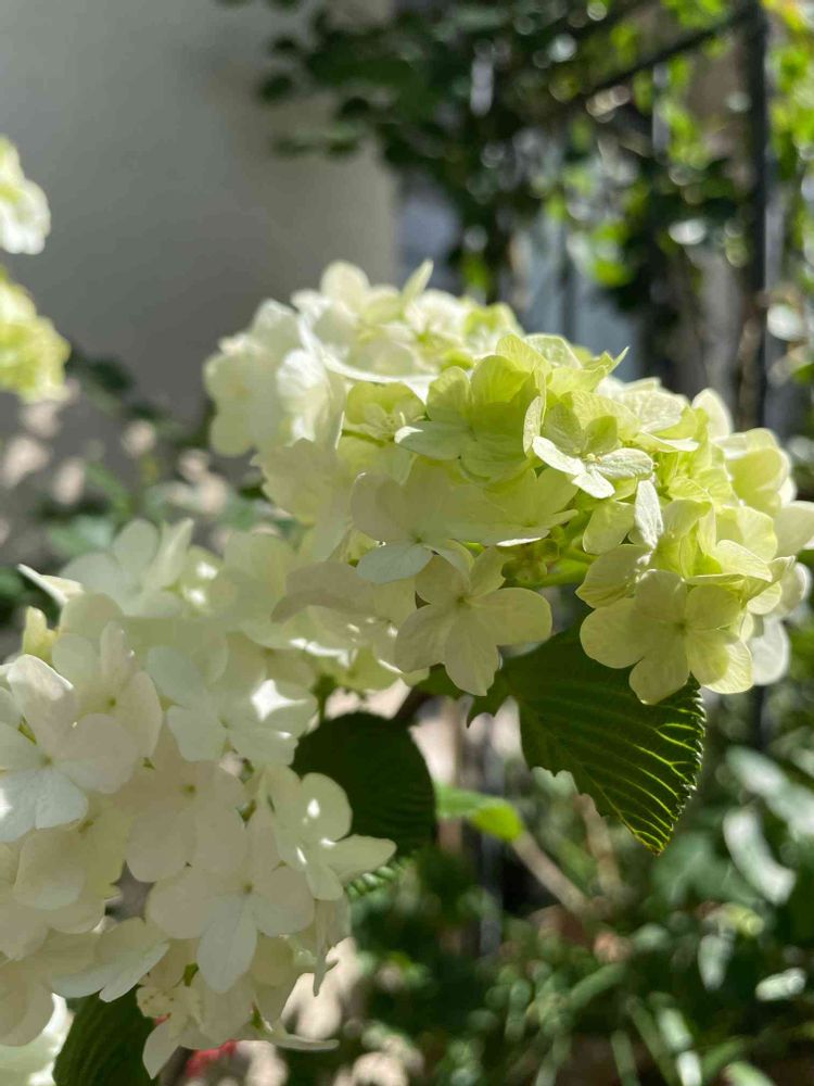 小さな花が集まり手鞠の様な姿が可愛らしくグリーンから白に変わっていく様は