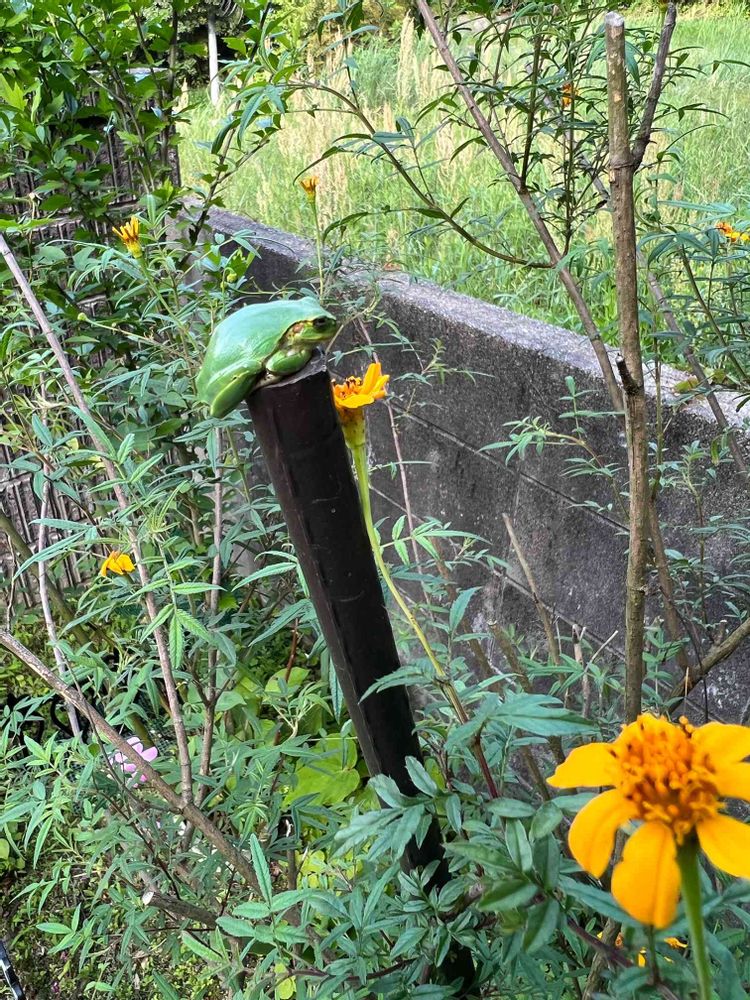 レモンマリーゴールドの支柱のテッペンで夕涼みしてるアマガエルくん🐸