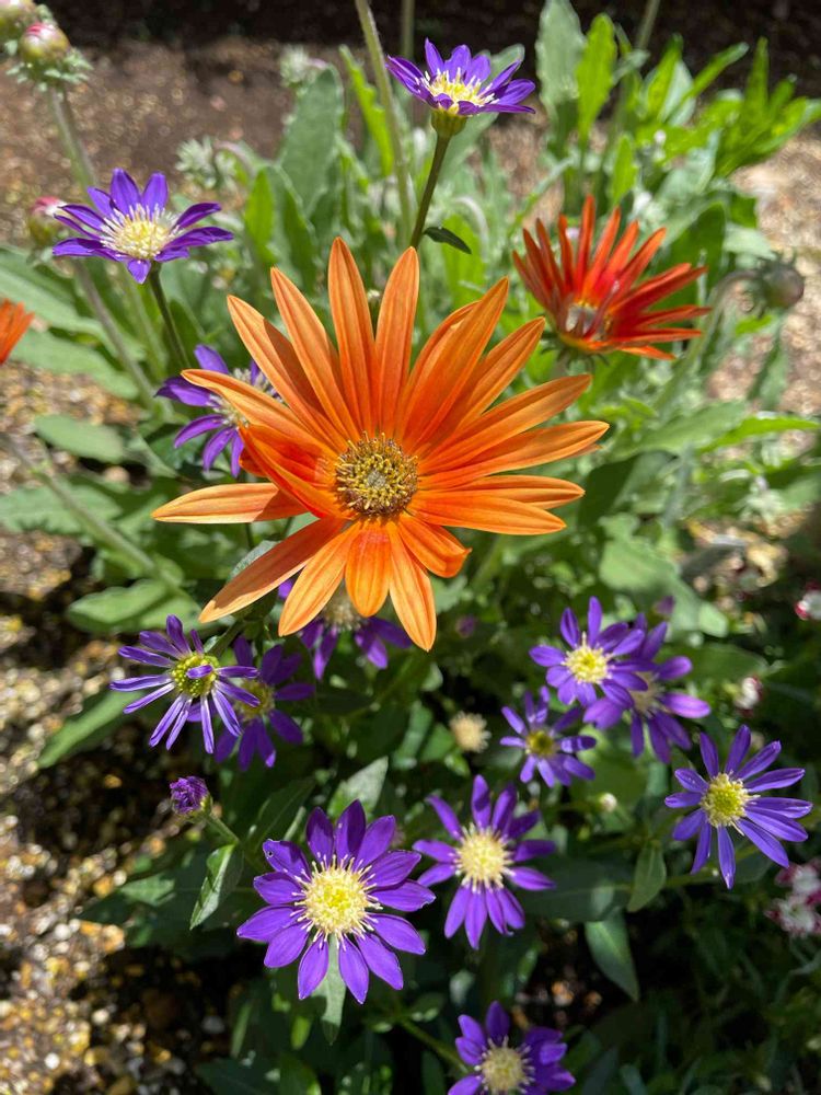 陽射しの中でお花たちがキラキラ輝く!オレンジ色のアークトチスと、紫のミヤコワスレがコラボ中♪