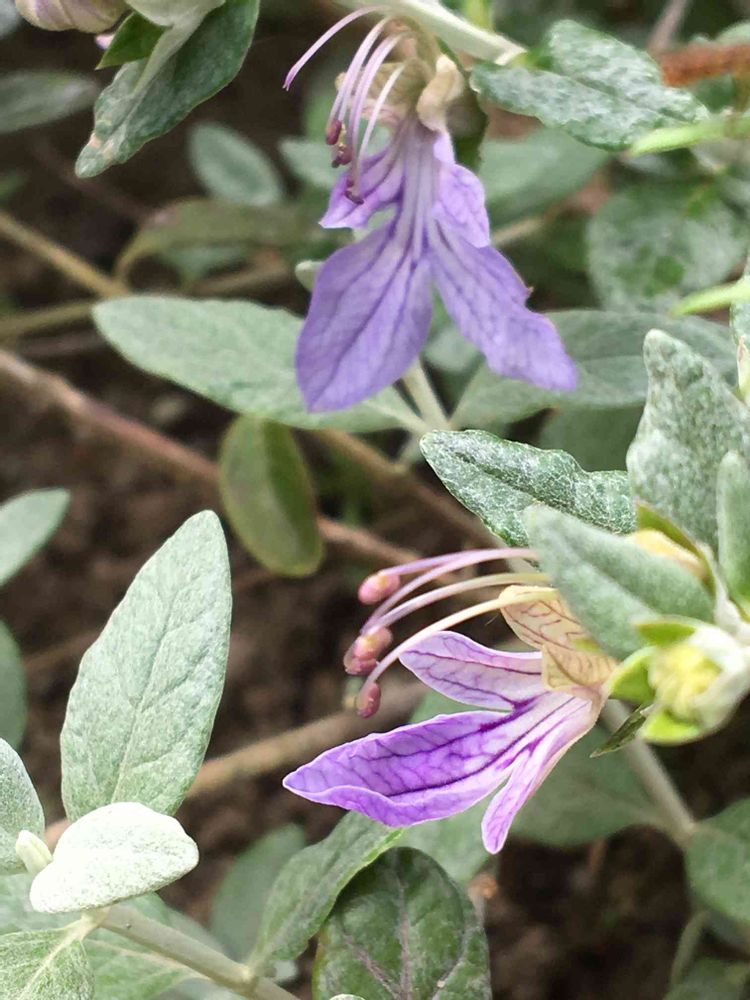 枝を直角に伸ばすツリージャーマンダー、小さくカットしたけれど薄紫のお花が咲き始めました。